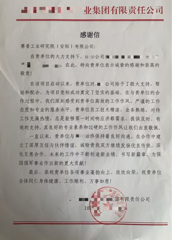 近期,賽普工業(yè)研究院(安陽)有限公司(以下簡稱“賽普公司”)再次收到來自客戶的感謝信,客戶對公司在某特種裝備生產(chǎn)任務(wù)中提供的卓越支持予以高度評價。今年以來,賽普公司已多次獲得客戶的書面感謝和電話感謝。贊譽(yù)的背后,是市場與客戶對賽普公司技術(shù)實力、服務(wù)品質(zhì)與履約精神的高度認(rèn)可與信賴。